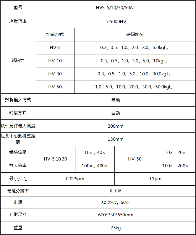 HVS-5/10/30/50AT触摸屏数显自动转塔维氏硬度计 产品介绍 1、机身使用优等铸铁一次浇铸成型,配合以汽车烤漆处理工艺,外形圆润美观; 2、配置了自动转塔功能,高分辨率的测量和观察物镜,结合内置长度编码器的高清数字测微目镜,实现了压痕对角线的一键测量,肖除人为操作干扰与读数误差; 3、便捷操作系统,可自动进行全硬度标尺的单位转换; 4、可设置硬度值的上限值和下限值,当测试值超过设定范围时,发出警报音; 5、具有软件硬度值修正功能,可以在一定范围内直接对硬度值进行修正; 6、具有数据库功能,对试验数据自动进行分组保存,每组可保存10个数据,可以保存2000个以上数据; 7、具有硬度值曲线显示功能,直观显示硬度值的变化; 8、可选配CCD图像处理系统,另可选配努氏压头进行努氏硬度测量; 9、配置无线蓝牙打印机,并可通过RS232、USB接口输出数据; 10、精度符合GB/T4340.2-2018 ISO6507-2 和美国ASTME384。 应用范围 1、黑色金属、有色金属、IC薄片,表面涂层、层压金属; 2、玻璃、陶瓷、玛瑙、宝石、薄塑料等; 3、碳化层和淬火层的深 度及梯度的硬度测试; 4、适用于平行平面和微小零件及超薄零件的精 密维氏测量。 技术参数 ![]() 附件配置