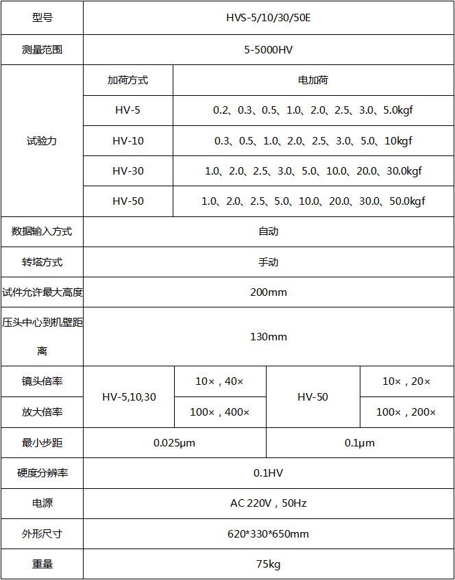 HVS-5/10/30/50E数显维氏硬度计 产品介绍 1、产品机身部分由浇铸工艺一次成型,并经过了长时间的时效处理。相对于拼板工艺,长期使用形变量小,并可有 效适应各种恶劣的环境; 2、汽车烤漆,漆质档次高,抗划伤能力强,使用多年依然光亮如新; 3、高 级光学工程师设计的光学系统不仅图像清晰,还可作为简单的显微镜使用,亮度可调,视觉舒服,长时间操作不容易疲劳; 4、采用高分辨率的测量和观察物镜,结合内置了长度编码器的高清数字测量目镜,实现了压痕对角线长度的一键测量,摆脱了读取过程中手动输入的误差和烦恼; 5、具有较高的测试精度,操作简单、灵敏度高、使用方便,示值稳定等特点;采用电子闭环控制施加试验力;完全实现了试验力的自动施加、保持、卸除、硬度值直接显示等功能。结构模块化设计,开机即用,无需安装砝码; 6、可选配CCD图像处理系统以及视 频测量装置; 7、配置了蓝牙模组,蓝牙打印机,并可选配蓝牙PC接 收器实现无线打印和无线数据传输; 8、精度符合GB/T4340.2 ISO6507-2 和美国ASTME384。 应用范围 1、黑色金属、有色金属、IC薄片,表面涂层、层压金属; 2、玻璃、陶瓷、玛瑙、宝石、薄塑料等; 3、碳化层和淬火层的深 度及梯度的硬度测试; 4、适用于平行平面和微小零件及超薄零件的精 密维氏测量。 技术参数 ![]() 附件配置
