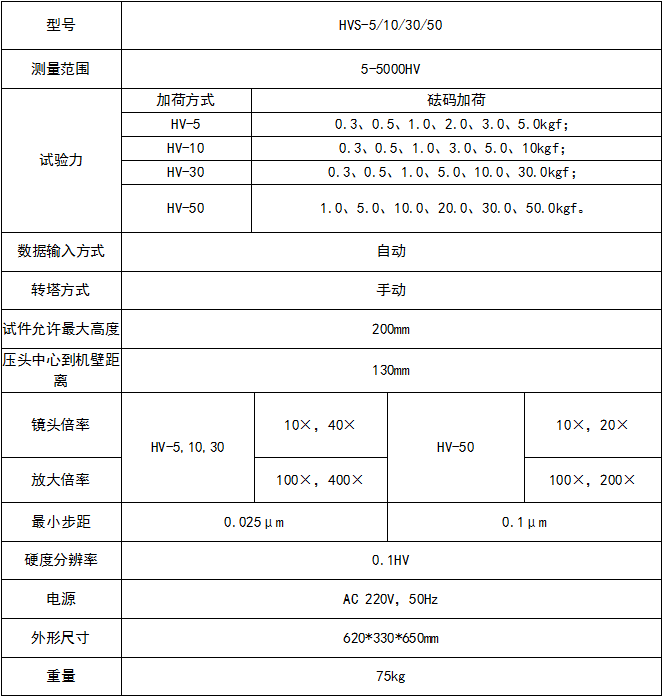 HVS-5/10/30/50数显维氏硬度计 产品介绍 1、产品机身部分由浇铸工艺一次成型,并经过了长时间的时效处理。相对于拼板工艺,长期使用形变量小,并可有 效适应各种恶劣的环境; 2、汽车烤漆,漆质档次高,抗划伤能力强,使用多年依然光亮如新; 3、高 级光学工程师设计的光学系统不仅图像清晰,还可作为简单的显微镜使用,亮度可调,视觉舒服,长时间操作不容易疲劳; 4、采用高分辨率的测量和观察物镜,结合内置了长度编码器的高清数字测量目镜,实现了压痕对角线长度的一键测量,摆脱了读取过程中手动输入的误差和烦恼; 5、可选配CCD图像处理系统以及视 频测量装置; 6、配置了蓝牙模组,蓝牙打印机,并可选配蓝牙PC接 收器实现无线打印和无线数据传输; 7、精度符合GB/T4340.2 ISO6507-2 和美国ASTME384。 应用范围 1、黑色金属、有色金属、IC薄片,表面涂层、层压金属; 2、玻璃、陶瓷、玛瑙、宝石、薄塑料等; 3、碳化层和淬火层的深 度及梯度的硬度测试; 4、适用于平行平面和微小零件及超薄零件的精 密维氏测量。 技术参数 ![]() 附件配置